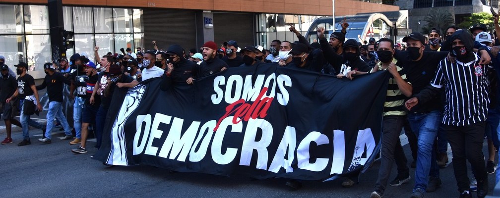 São Paulo witnessed a tense standoff for four hours, including a real pitched battle for two hours, between two unequal sides. The Military Police of São Paulo, the best trained, best equipped in the country, on one the side. Anti-fascist on the other side organized by soccer fans, mostly from the Corinthians’ Faithful Hawks club (Gaviões da Fiel), but also Palmeiras, São Paulo and “antifa” Santos fan clubs as well. They decided to demonstrate for democracy near where the São Paulo Bolsonarists usually meet at the same time.